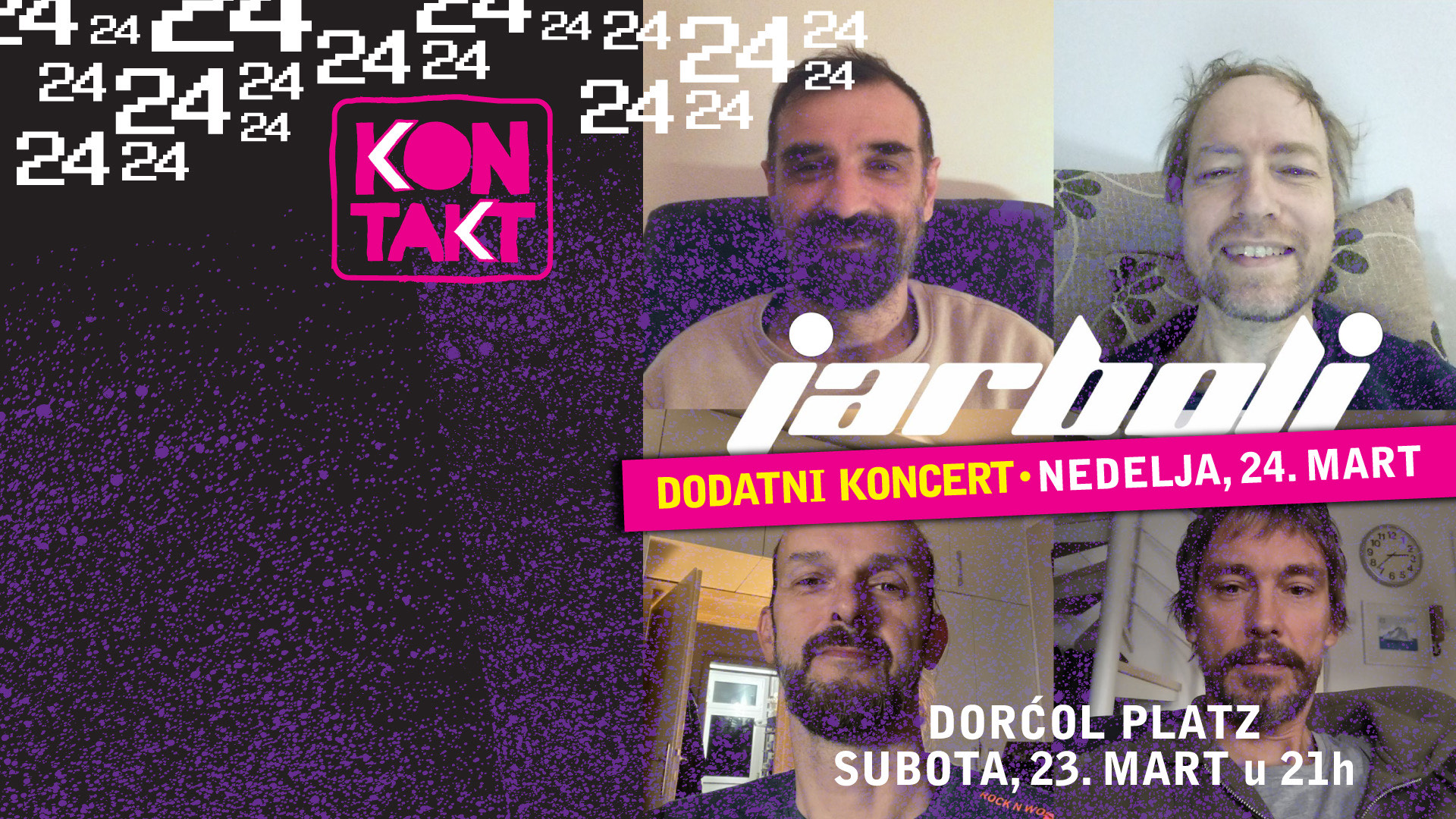Due to immense interest in Jarbol’s concert as part of the Kontakt conference, showcase, and festival, as a gift to all guests of our most important music conference and to all Belgraders who haven’t had the opportunity to see the band in a solo concert for a full eight years, Jarboli, Kontakt, and the promotion company Odličan Hrčak will organize another full-fledged concert of this iconic Belgrade band on March 24th, 2024, at the same location – at Dorćol Platz.